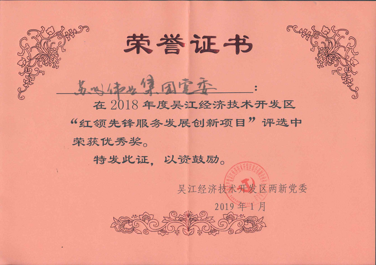 2019年1月18日,在吳江經(jīng)濟開發(fā)區(qū)人社工作表彰大會上,建工支部申報的“提高鋁?,F(xiàn)澆混凝土施工一次驗收合格率”項目獲得了區(qū)“紅領先鋒服務發(fā)展創(chuàng)新項目”優(yōu)秀獎。沈海榮代表團隊上臺領獎。